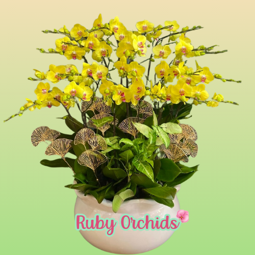Chậu Lan Hồ Điệp gồm 20 cành vàng 2035, màu vàng 2035 tựa như màu vàng của những cánh hoa mai, là màu hoa rất bền trong các dòng lan. Dưới sự khéo léo của nhân viên nhà Ruby Orchids, các cành lan được ghép vào chậu phân chia thành 4 tầng, ở tầng dưới cùng có 6 cành lan, lên trên là 2 tầng với mỗi tầng 5 cành và trên cùng là 4 cành lan. Những bông lan được sắp xếp hướng về một mặt để ta ngắm trọn vẻ đẹp của những cành hoa.